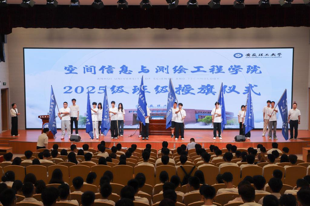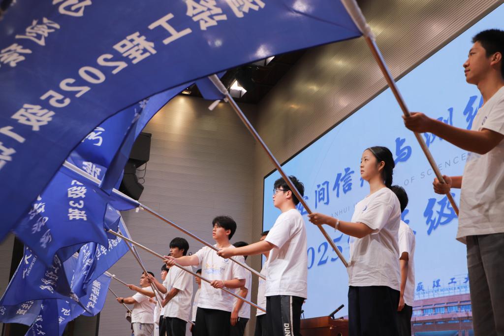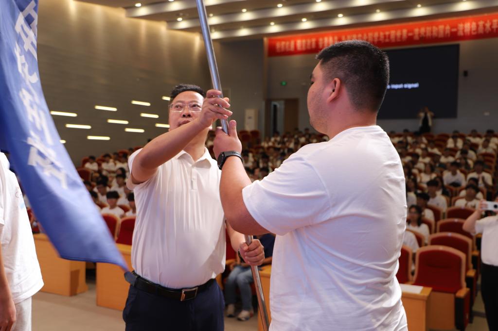 在庄重的授旗仪式环节,院长王磊为各新生班级一一授旗。各班学生代表郑重接过班旗,挥舞的旗帜展现了新生集体昂扬向上的精神风貌。班旗不仅象征集体的身份,更承载着学院的期望与重托。