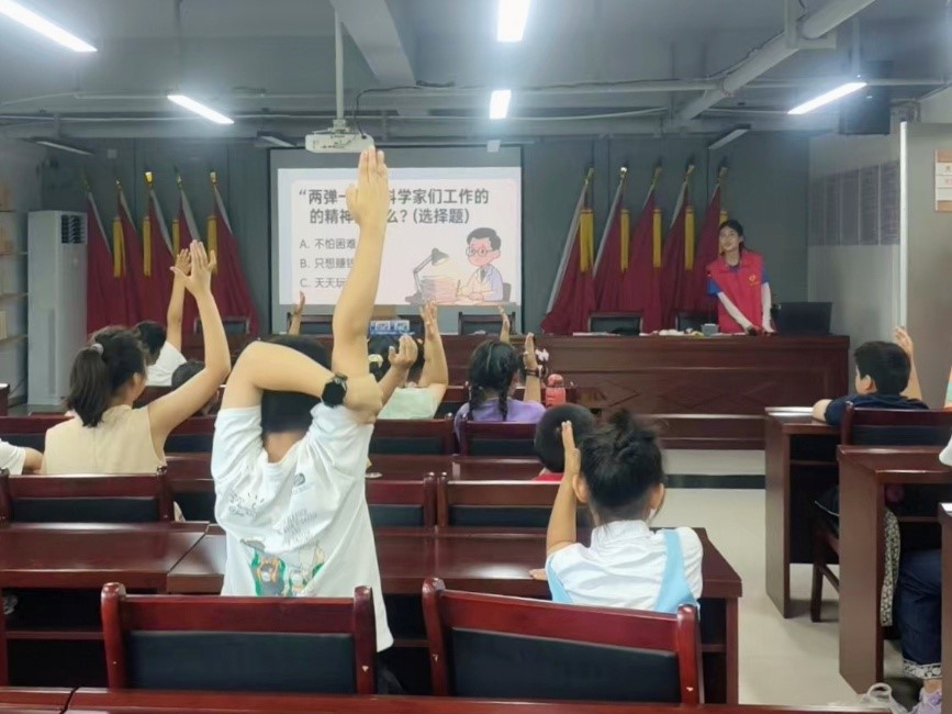 6月28日下午,实践团队带着从纪念馆汲取的精神养分和精心设计的宣讲方案,赴安理社区党群服务中心开展科普宣讲,结合精美的PPT课件,通过图片、视频等多媒体手段,向孩子们生动形象地展示并声情并茂地讲解了我国科技人员在研制“两弹一星”过程中的艰辛付出和辉煌成就。