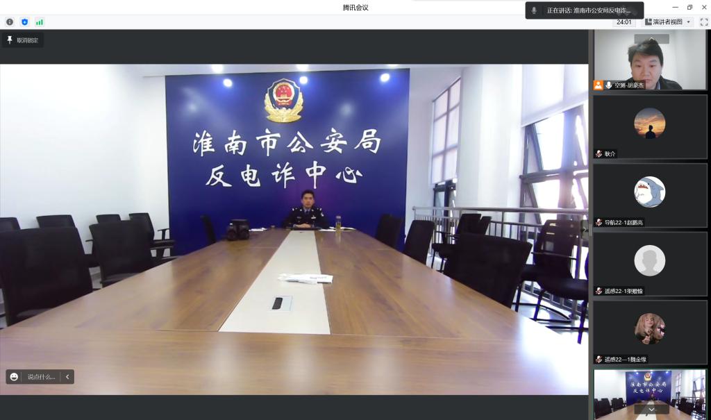 邀请淮南市公安局反电诈中心副主任徐虎开展防传销反欺诈宣传教育讲座,学院共计200余名学生线上参与了此次讲座。